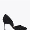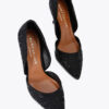 Kurt Geiger to marka znana ze swojej wyrafinowanej kolekcji damskich szpilek, a w szczególności z modelu, którym charakteryzuje smukły i wysoki złoty obcas. Te buty emanują niezwykłą elegancją, zachwycając swoją ponadczasową konstrukcją. Ich forma jest niezwykle harmonijna, a wycięte boki dodają im unikalnego uroku, eksponując stopę w gustowny sposób. Projekt jest wykonany z czarnego mikrozamszu ozdobionego czarnymi kryształkami tworzącymi efekt pikowania.