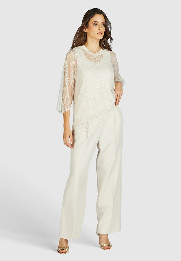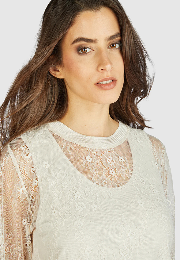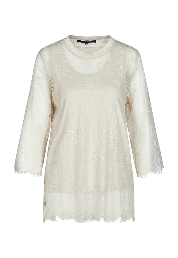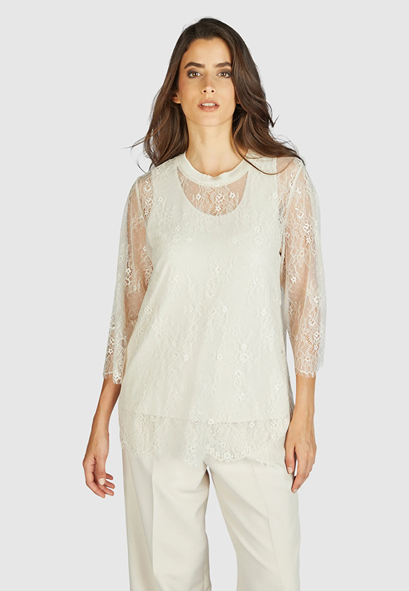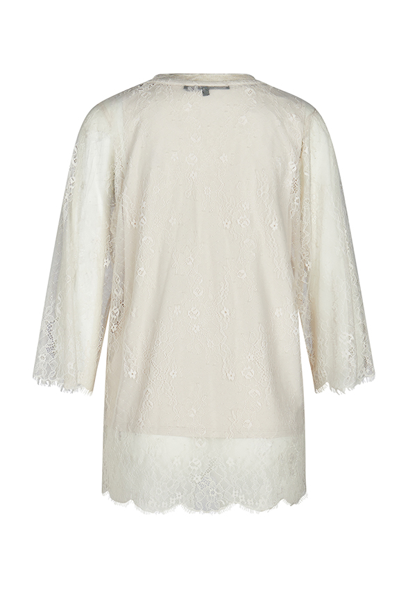 Wykonana z najdelikatniejszej koronki elegancka bluzka zachwyca najwyższą jakością. Rękawy o długości 3/4 i swobodny, szeroki krój sprawiają, że jest naprawdę wygodna w noszeniu. Rękawy odsłaniają prześwitujący efekt wyrafinowanej koronki, jednocześnie posiadając podszewkę, dzięki czemu bluzka jest nieprzezroczysta.