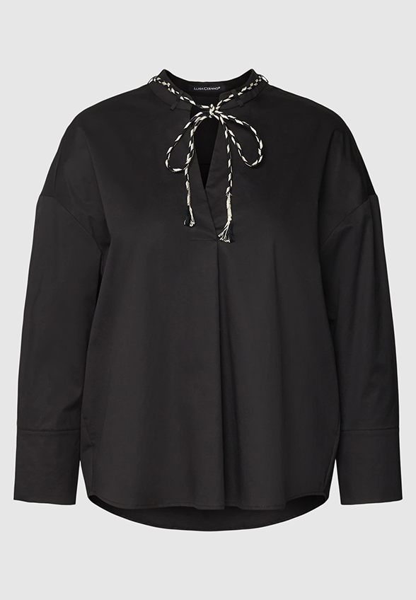 Luksusowa bluzka bez kołnierzyka z eleganckiego, nieprzezroczystego materiału. Szerokie rękawy z wąskimi mankietami, obniżona linia ramion i wiązanie pod szyją dopełniają całość.