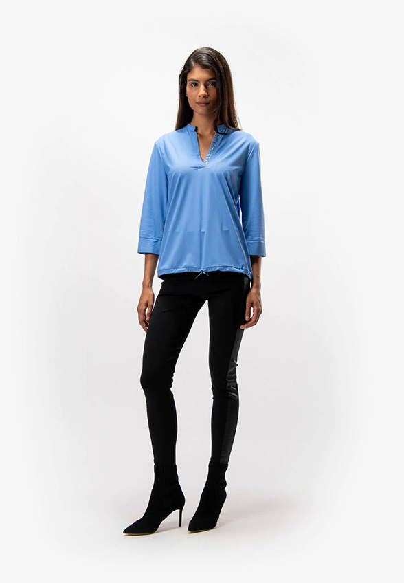 Wygodna i szykowna letnia wsuwana bluzka ze stójką i rękawami ¾ z lekkiego dżerseju. Subtelny dekolt w kształcie litery V jest ozdobiony tonalnym motywem dżetów. Dół jest wykończony sznurkiem ściągającym. Zawartość elastycznych włókien zapewnia wyjątkowy komfort.