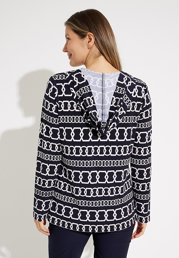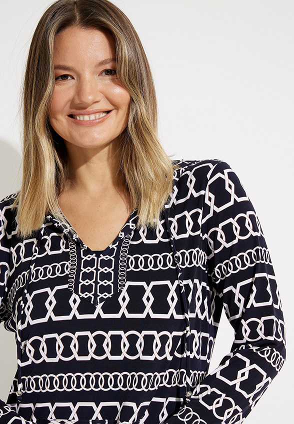 Będziesz wyglądać i czuć się elegancko w tej dopasowanej bluzie marki Joseph Ribkoff. Model ozdobiony nadrukiem łańcucha. Konstrukcja składa się z dekoltu w szpic, długich rękawów oraz kaptura.