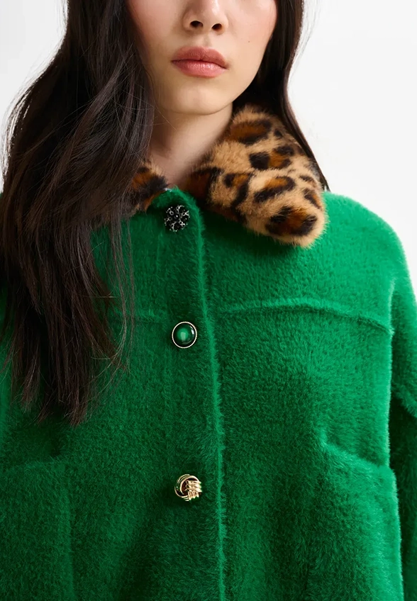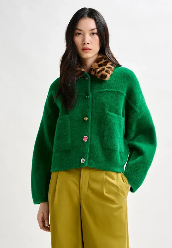 Kardigan Essentiel Antwerp to odważny akcent w garderobie, łączący swobodny, luźny krój z artystycznym wyczuciem detalu. Niedopasowane guziki i praktyczne naszywane kieszenie wprowadzają lekko figlarny charakter, a odpinany kołnierz ze sztucznego futra w panterkę pozwala bawić się stylem i personalizować look. To połączenie codziennego komfortu z unikalnym, modowym akcentem, idealne do warstwowych stylizacji lub jako samodzielny element wyrażający indywidualność.