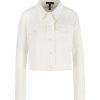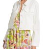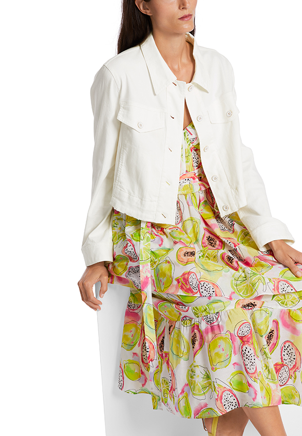 Dopasowana do sylwetki kurtka wykonana z białej bawełny z dodatkiem elastanu. Model opatrzony etykietą „Rethink Together”. Kurtka posiada kołnierz, podwójne szwy, boczne kieszenie i kieszenie z patką na piersi. Pas posiada regulacje szerokości, dół został surowo wykończony. Całość zapinana na guziki.