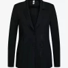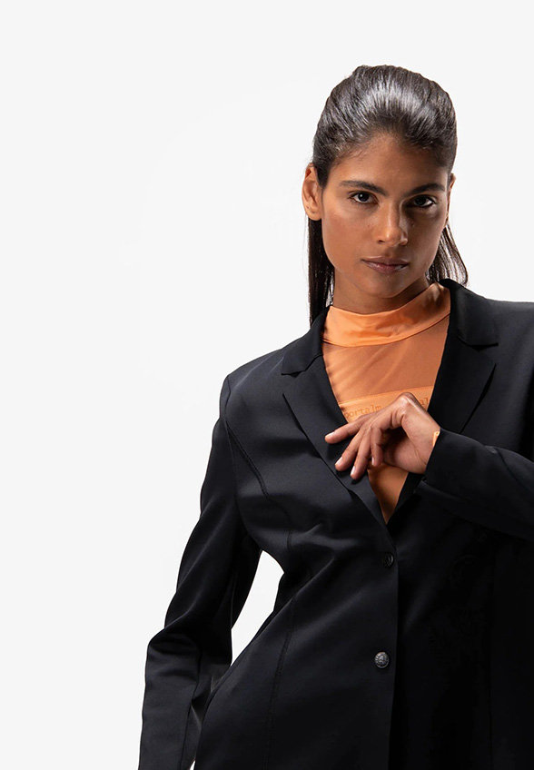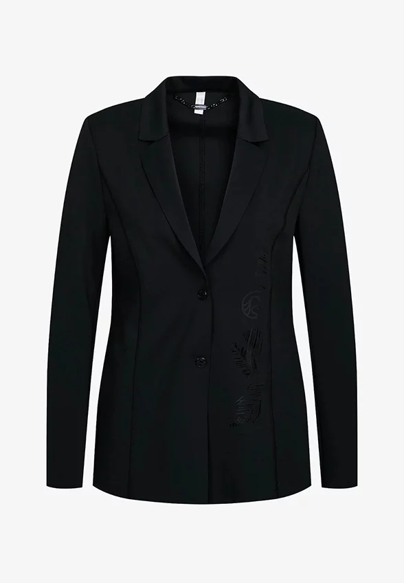 Modny blezer wykonany z wysokiej jakości tkaniny scuba emanuje czarującym połączeniem sportowej elegancji i miejskiego luzu. Długi, wąski krój dopasowuje się do każdej sylwetki. Przyciągającym wzrok elementem jest ekskluzywny nadruk transferowy z przodu po lewej stronie w okolicy talii. Płaskie szwy nadają marynarce sportowy charakter. Dwa zatrzaski na środku z przodu zapinają marynarkę.