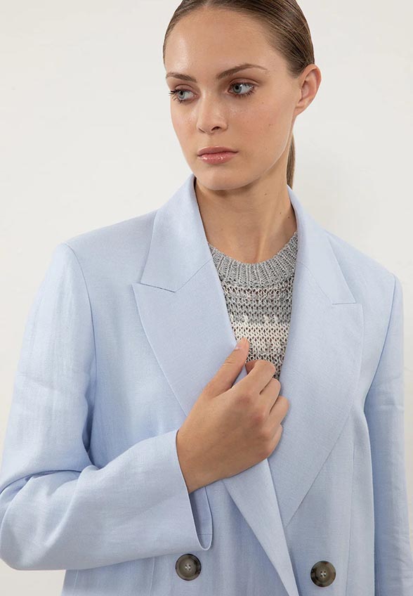 Niezwykle elegancka marynarka z podszewką wykonana z czystego, szlachetnego lnu. Szykowny design podkreśla kołnierz klapowy, dwurzędowe zapięcie na guziki i ozdobne kieszenie z patkami. Model perfekcyjnie sprawdzi się zarówno jako propozycja na biznesowe spotkania, jak i do bardziej casualowych stylizacji, zapewniając komfort w pełne słońca dni.