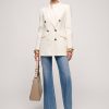 Wyjątkowa dwurzędowa marynarka z mieszanki wełny ze spiczastymi klapami i okrągłymi guzikami z pozłacanego metalu. Kieszenie z klapkami. Luźny krój.