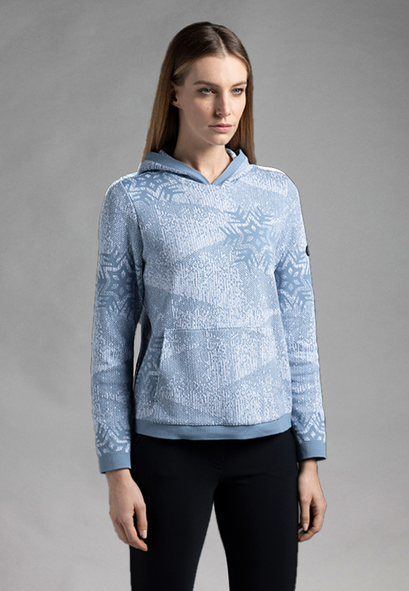 Niezwykły sweter autorstwa cenionej marki NEWLADN. Model zdobiony przepięknym, zimowym wzorem, gwarantuje komfort i styl we wszystkich warunkach atmosferycznych, w czasie zimowej aktywności czy spaceru. Łączy w sobie ponadczasowy design z technicznymi właściwościami tkaniny, które idealnie sprawdzą się podczas ekstremalnych warunków pogodowych, zapewniając maksymalny komfort. Sweter posiada funkcyjny kaptur oraz jest wykonany z wygodnej i elastycznej DHtech 400®
