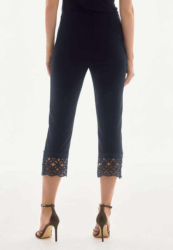 Nasze charakterystyczne spodnie z jedwabistej dzianiny są ozdobione elegancką koronką i cekinami u dołu nogawki. Posiadają zaszewki z tyłu dla bardziej precyzyjnego dopasowania i dyskretny elastyczny pas dla niezrównanego komfortu. Fałszywa muszka i subtelna ozdoba JR doskonale wykańczają całość. Część kolekcji Signature.