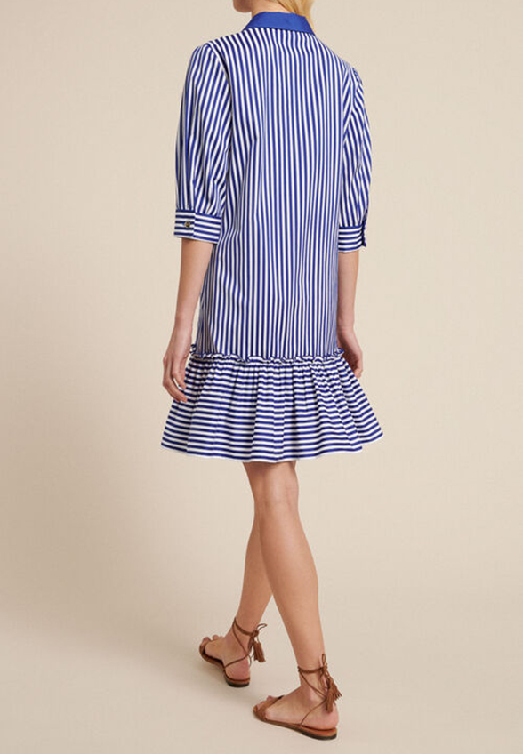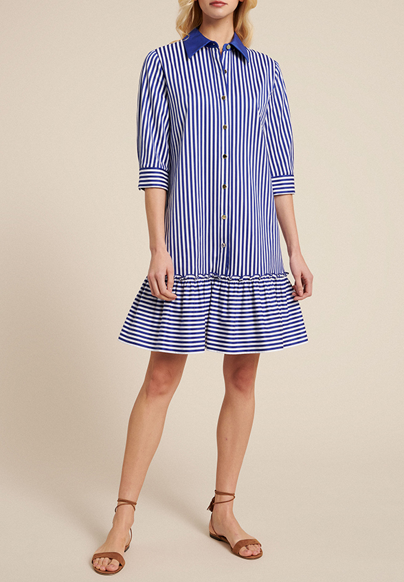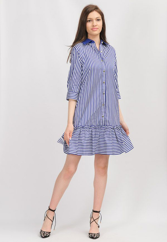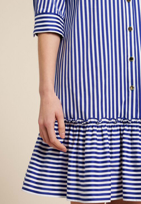 Unikalna krótka sukienka z bawełny w paski z koszulowym kołnierzykiem w jednolitym kolorze, krótkie rękawy, falbaniasty dół wykończony marszczeniem, boczne kieszenie. Zapinana na metalowe guziki. Regularny krój.
