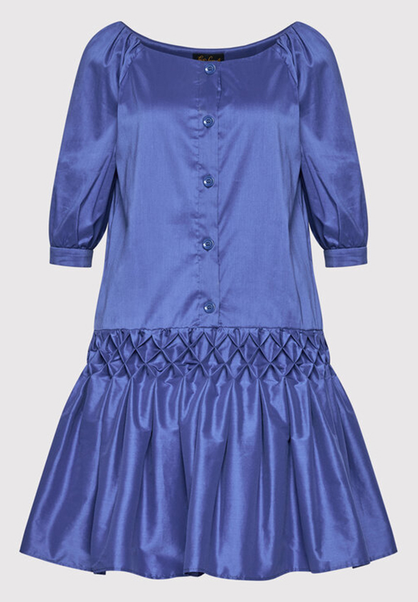 Unikalny projekt sukienki o długości mni oraz z okrągłym, dziewczęcym dekoltem. Konstrukcja dołu złożona jest z misternej, obszernej falbany z przepięknymi plisowaniami w romby. Konstrukcja zapięciem na guziki oraz rękawami do łokci zakończonymi mankietami. Niezwykła architektura i przepiękny odcień błękitu w niebanalny sposób podkreśli kobiecość noszącej ten wyjątkowy projekt kobiety.