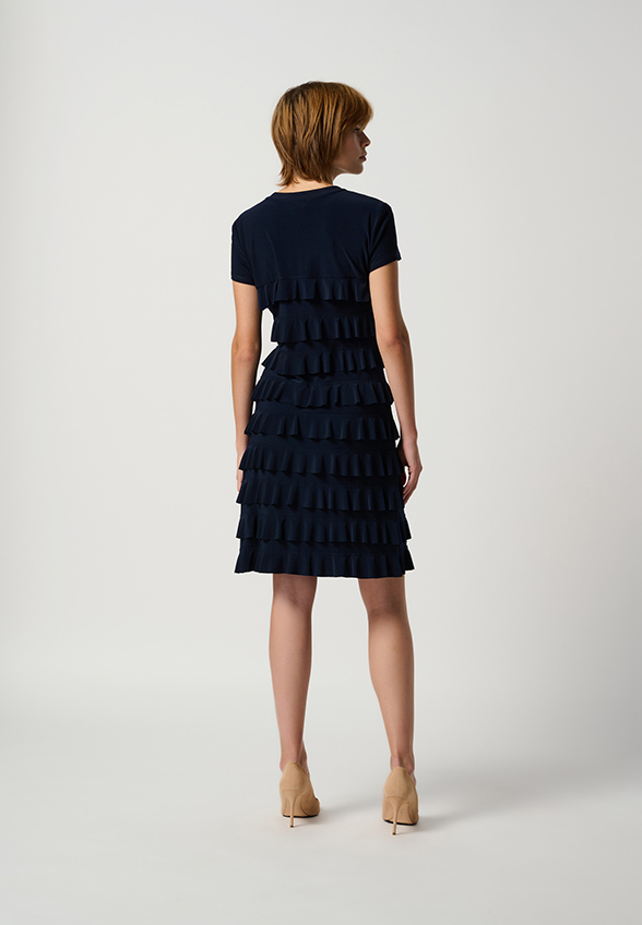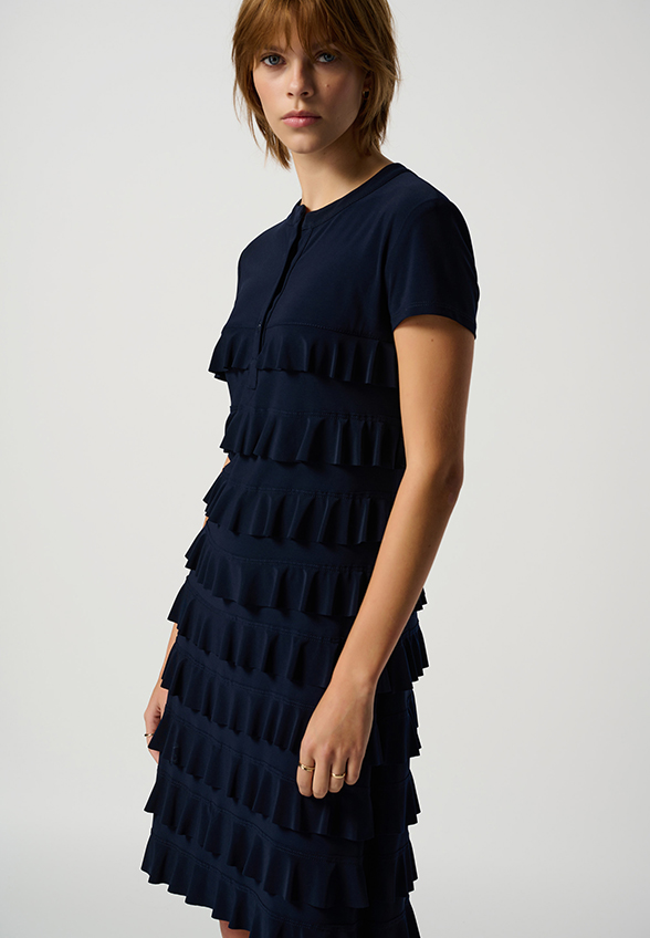 Wyjątkowa kobieca i elegancka sukienka autorstwa renomowanej marki Joseph Ribkoff. Krótki rękaw oraz delikatne falbanki nadają sukience lekkości i dziewczęcego uroku. Fason trapezowy, dopasowany w okolicy biustu, dokładnie podkreśla sylwetkę, jednocześnie nie krępując ruchów. Dekolt w serek, zapinany na guziki nadaje klasycznego tonu całości. Model niebywale wygodny oraz wybitnie uniwersalny, doskonale łączy się z różnego rodzajami obuwia – zarówno z eleganckimi szpilkami, jak i sportowymi sneakersami, dając nieskończone możliwości stylizacyjne.