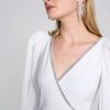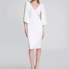 Poznaj urok tej zjawiskowej dopasowanej sukienki z jedwabistej dzianiny. Jej zawijany dekolt olśniewa wykończeniem z dżetów, uzupełniając szyfonowe rękawy o długości 3/4, które mają poduszki na ramionach dla dodania szyku. Niewidoczny zamek błyskawiczny z tyłu gwarantuje idealne dopasowanie.