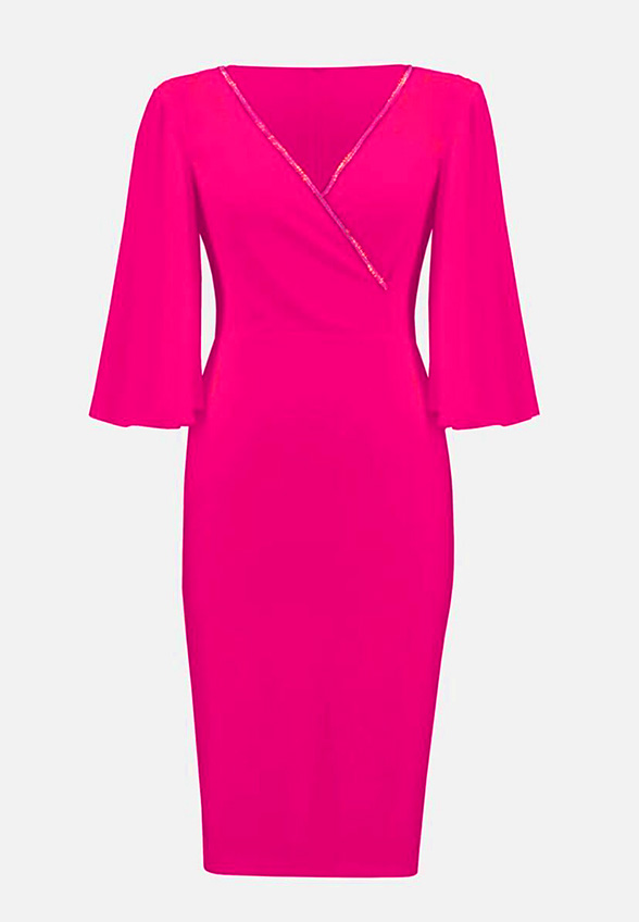 Poznaj urok tej zjawiskowej dopasowanej sukienki z jedwabistej dzianiny. Jej zawijany dekolt olśniewa wykończeniem z dżetów, uzupełniając szyfonowe rękawy o długości 3/4, które mają poduszki na ramionach dla dodania szyku. Niewidoczny zamek błyskawiczny z tyłu gwarantuje idealne dopasowanie.