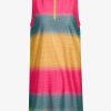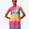 Ekscytująca i sportowa sukienka golfowa bez rękawów z małą stójką. Wykonana z drukowanej stebnówki w połączeniu z letnim dżersejem pod spodem. Zdobiona kolorowym nadrukiem z efektem blokowym. Krótki zamek błyskawiczny z przodu ułatwiaj zakładanie. Tradycyjna metka po wewnętrznej stronie zastąpiona nadrukiem transferowym. Oddzielne spodnie z dżerseju zapewniają swobodę ruchów.