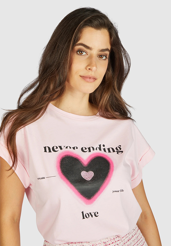 Przepiękna, wysokiej jakości koszulka z modnym nadrukiem „Heart”. Klasyczny krój z krótkimi rękawami i okrągłym dekoltem jest absolutnie ponadczasowy. Wykonana z przyjaznej dla skóry czystej bawełny z oznakowaniem ,,Better Cotton Initiative”.