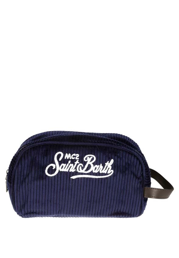 Stylowa kosmetyczka cenionej marki MC2 Saint Barth. Model wykonany z niezwykle miękkiego, prążkowanego sztruksu oraz brązowych elementów ekoskóry. Posiada dwa uchwyty, zapięcie na suwak oraz funkcjonalną wodoodporną podszewkę. Front został przyozdobiony naszytym, kontrastowym logotypem marki.