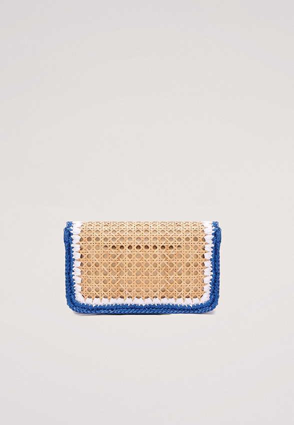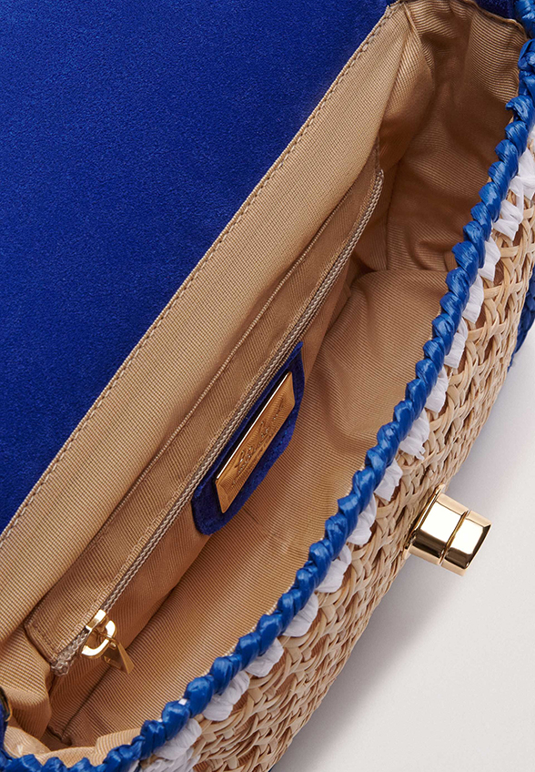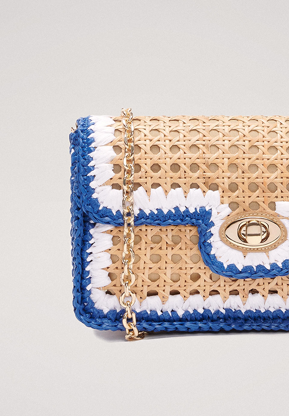 Mini torebka renomowanej marki Luisa Spagnoli, to wyjątkowy dodatek, który zachwyci każdą kobietę. Wykonana i zaprojektowana we Włoszech z wysokiej rattanu. Model na ramię z klapką, ozdobiona kolorowymi krawędziami z rafii, które tworzą ramkę wokół pozłacanego metalowego zapięcia i reszty torby.